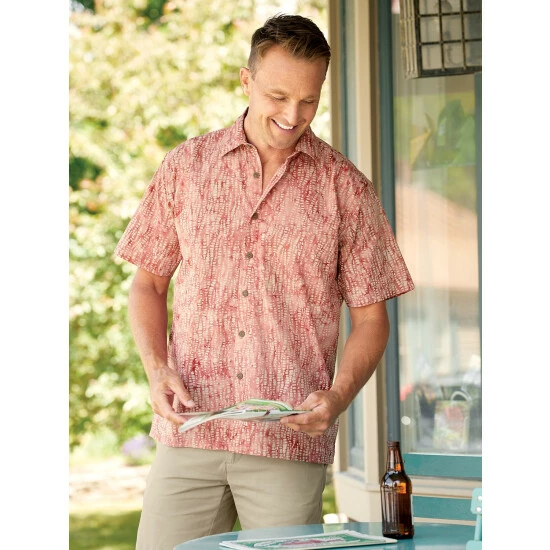 This is the shirt that will usher you to the head of the conga lineβevery time! It’s fun and festive and hand-printed in Bali by local artisans, which gives it a fresh tropical look and feel. It’s made of soft breathable cotton, so it will keep you feeling as cool as you look. Other details include real wooden buttons along the full button front, a box pleat in the back for freedom of movement, a straight hem with side slits, and a single chest pocket.