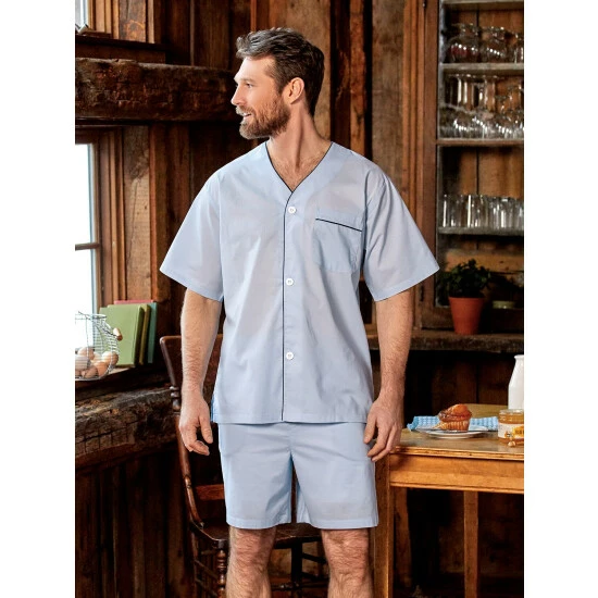 For generations, cotton batiste sleepwear has been a top choice for warm-weather sleeping. Itβs lightweight without being flimsy, and the quality construction details are, frankly, what you expect in premium sleepwear.The short-sleeve top has a V-neck, full button front, and a chest pocket; the short bottoms have an adjustable drawstring waist and side-seam pockets.