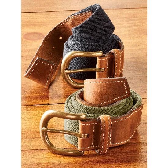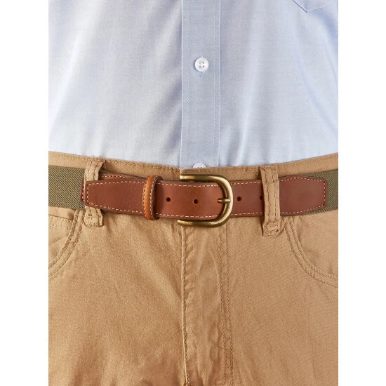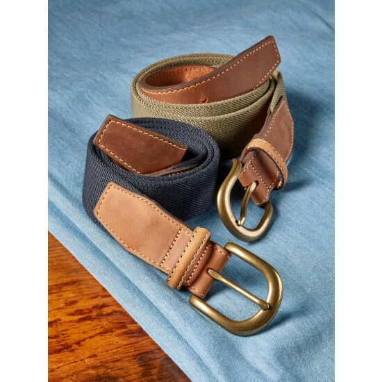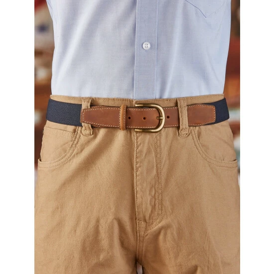 Tired of your current belt digging into your sides and constricting you when you bend or sit? Then it’s time to switch to this forgiving twill belt. It stretches when you move, giving you the added room you need to keep you comfortable no matter your position. It’s also great for when enjoying a big meal as it provides you with extra space without having to undo the antique-brass-finished buckle. Features genuine leather at the tapered ends of the belt.
