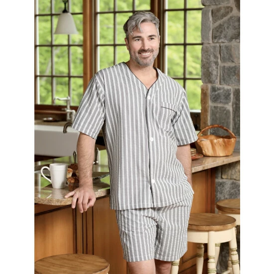 Our all-cotton short pajamas are available in three handsome stripesβbrick red with blue and white stripes, navy with green and white stripes, natural with navy and white stripesβa nice change from the traditional blue and white. The top is styled with a comfortable button-front V-neck and finished with accent piping; the short bottoms have an elastic waist with an adjustable drawstring for added comfort.