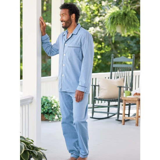 These classic pajamas are made with quality craftsmanship that lets you know these are no fly-by-night PJsβthey’re built for comfort and made to last. The PJs have a long-sleeve top with a notched lapel collar and chest pocket. The matching bottomshave a 6″ elastic waistband in the back with a drawstring front and button fly. The unique 3-piece seat construction ensures they won’t bind or constrict while sleeping or lounging.Pajamas run large, order accordingly.
